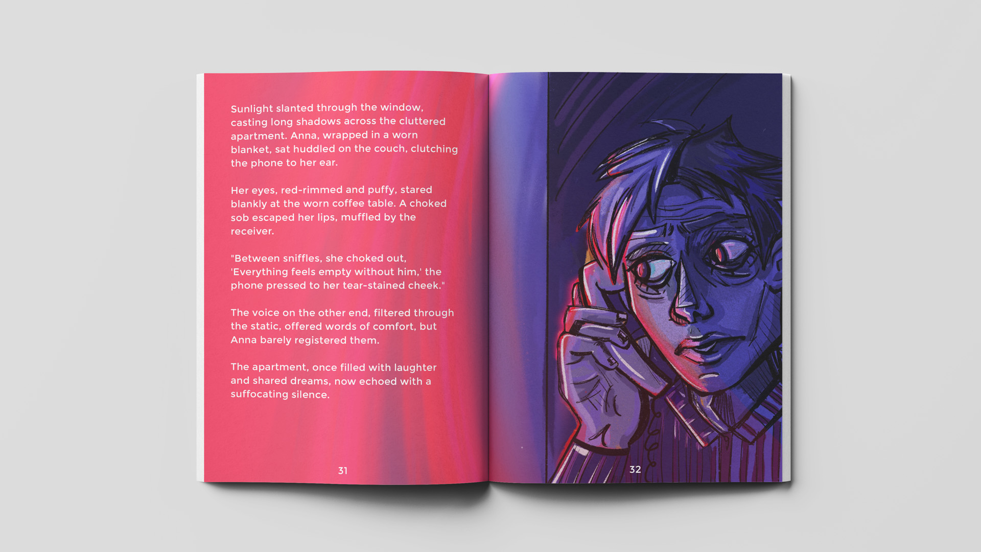 The colors used in this illustration set the sentiments of the scenes happening. The darker colors, blue and purple give the feeling of agitation, sadness, while the bright colors are foreshadowing that something unexpected will happen.